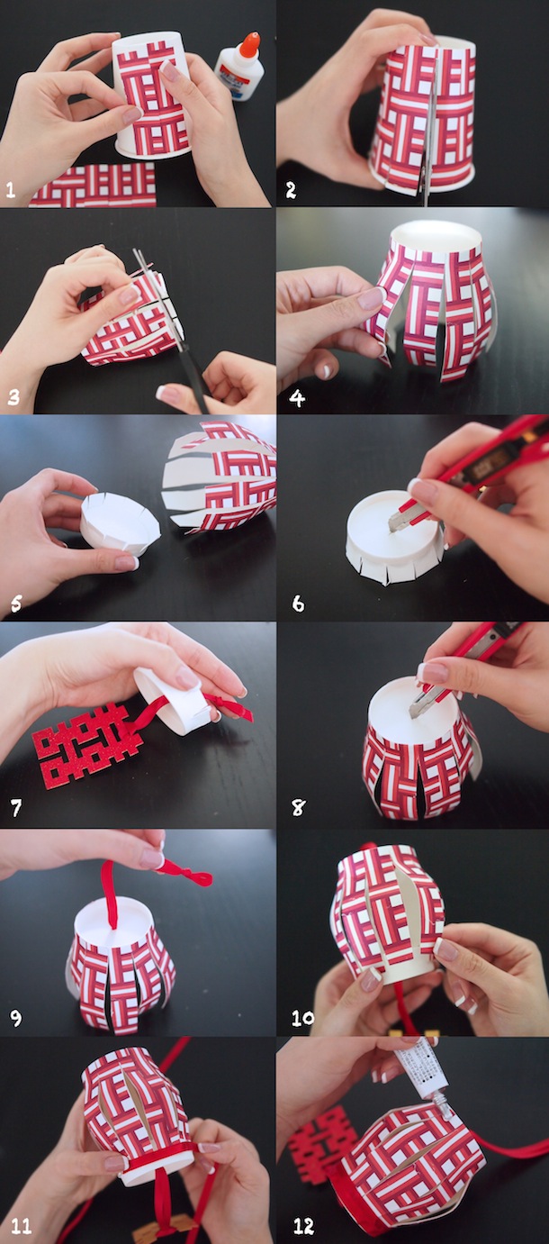1. Stick patterned paper on to your paper cup. I chose a red base paper as I want to keep the Chinese flavour.